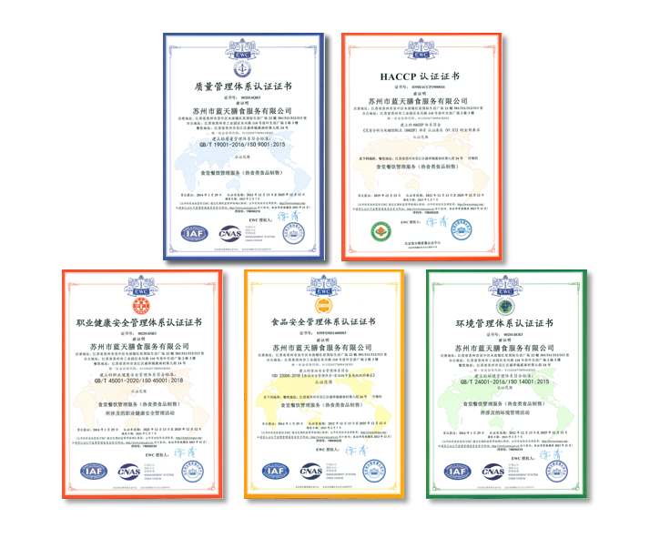 作为行业标准化先行者,公司率先通过 ISO9001 质量管理体系、ISO14001 环境管理体系、ISO22000 食品安全管理体系、OHSAS18001 职业健康安全管理体系及 HACCP 危害分析与关键控制点体系五项国际权威认证。凭借卓越实力,先后荣膺 “江苏省餐饮行业协会会长单位”“中国团膳市场十大著名品牌”“中国膳食业质量信誉消费者(用户)满意十佳单位” 等重磅荣誉,跻身中国团餐领域第一梯队。