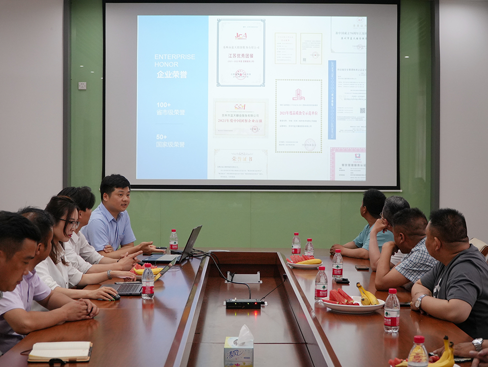 商务总监李俊毅首先对各位领导的莅临表示热烈的欢迎,并向领导汇报蓝天膳食的发展历程、产业布局、业务板块、供餐方案、经营管理模式等基本情况。