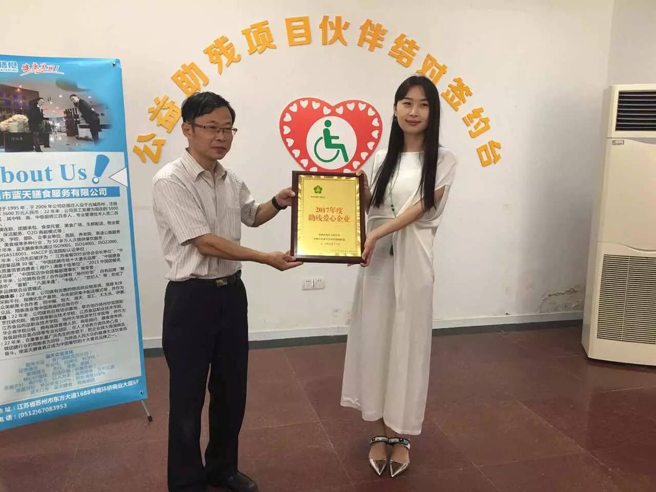 2017年7月10日上午,我司董事田亦琪女士和苏州残联陶建华处长在苏州文化助残公益园签署资助《手语评书》的协议,并捐赠善款2万元,这一活动被各大媒体争相报道。会后田亦琪女士接收访问,她表示,感谢《手语评书》栏目给予了蓝天膳食回馈社会的机会,希望更多的企业能够参与进来。