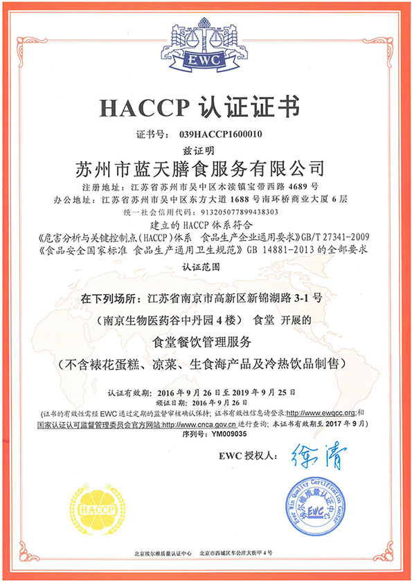 苏州市蓝天膳食服务有限公司是率先通过HACCP安全管理体系认证的餐饮企业。HACCP体系的认证,对蓝天膳食进一步提高产品质量,降低生产成本、商业风险,增强顾客和政府的信心,提升市场竞争力将起到积极的促进作用。